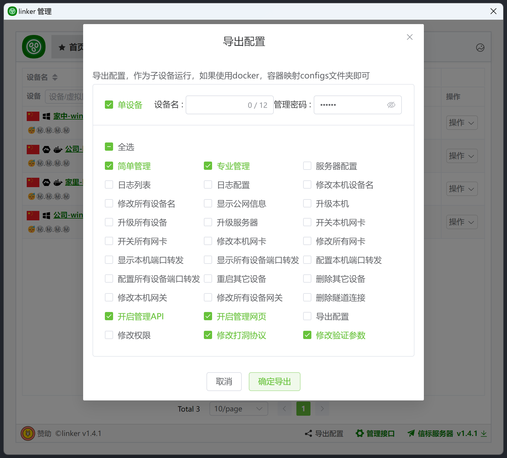 - 权限管理,主客户端拥有完全权限,可导出、配置子客户端配置,分配其管理权限