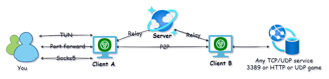 点对点、点对网、网对网,可自动分配虚拟IP。 - 端口转发: 在无法使用虚拟网卡,或者不想使用虚拟网卡的时候,可以使用一对一端口转发实现相互访问,相关说明请查看《关于单隧道实现多服务访问的端口转发状态管理的研究》。